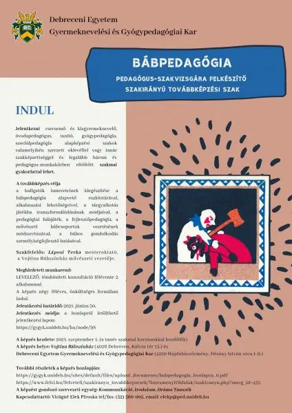 Meghirdetett munkarend: LEVELEZŐ, tömbösített konzultáció félévente 2 alkalommal. A képzés négy féléves, önköltséges formában indul. Jelentkezési határidő: 2021. június 30. Jelentkezés módja: a honlapról letölthető jelentkezési lapon: https://gygyk.unideb.hu/hu/node/98 Bábpedagógia pedagógus-szakvizsgára felkészítő szakirányú továbbképzési szak A továbbképzés célja a hallgatók ismereteinek kiegészítése a bábpedagógia alapvető eszköztárával, alkalmazási lehetőségeivel, a tárgyalkotás játékba transzformálódásának módjaival, a pedagógiai bábjáték, a fejlesztőpedagógia, a művészeti bábcsoportok vezetésének módszertanával, a bábos gondolkodás személyiségfejlesztő hatásával. Gyermeknevelési és Gyógypedagógiai Kar INDUL Jelentkezni csecsemő- és kisgyermeknevelő, óvodapedagógus, tanító, gyógypedagógia, szociálpedagógia alapképzési szakok valamelyikén szerzett oklevéllel vagy tanár szakképzettséggel és legalább három év pedagógus-munkakörben eltöltött szakmai gyakorlattal lehet. Debreceni Egyetem A képzés kezdete: 2021. szeptember 1. (a tanév szakmai kurzusokkal kezdődik) A képzés helye: Vojtina Bábszínház (4026 Debrecen, Kálvin tér 13.) és Debreceni Egyetem Gyermeknevelési és Gyógypedagógiai Kar (4220 Hajdúböszörmény, Désány István utca 1-9.) További részletek a képzés honlapján: https://gygyk.unideb.hu/sites/default/files/upload_documents/babpedagog… https://www.felvi.hu/felveteli/szakiranyu_tovabbkepzesek/!IntezmenyiOld… A képzést gondozó szervezeti egység: Kommunikáció, Irodalom, Dráma Tanszék Kapcsolattartó: Virágné Elek Piroska tel/fax: (52) 560-005, email: elekp@ped.unideb.hu