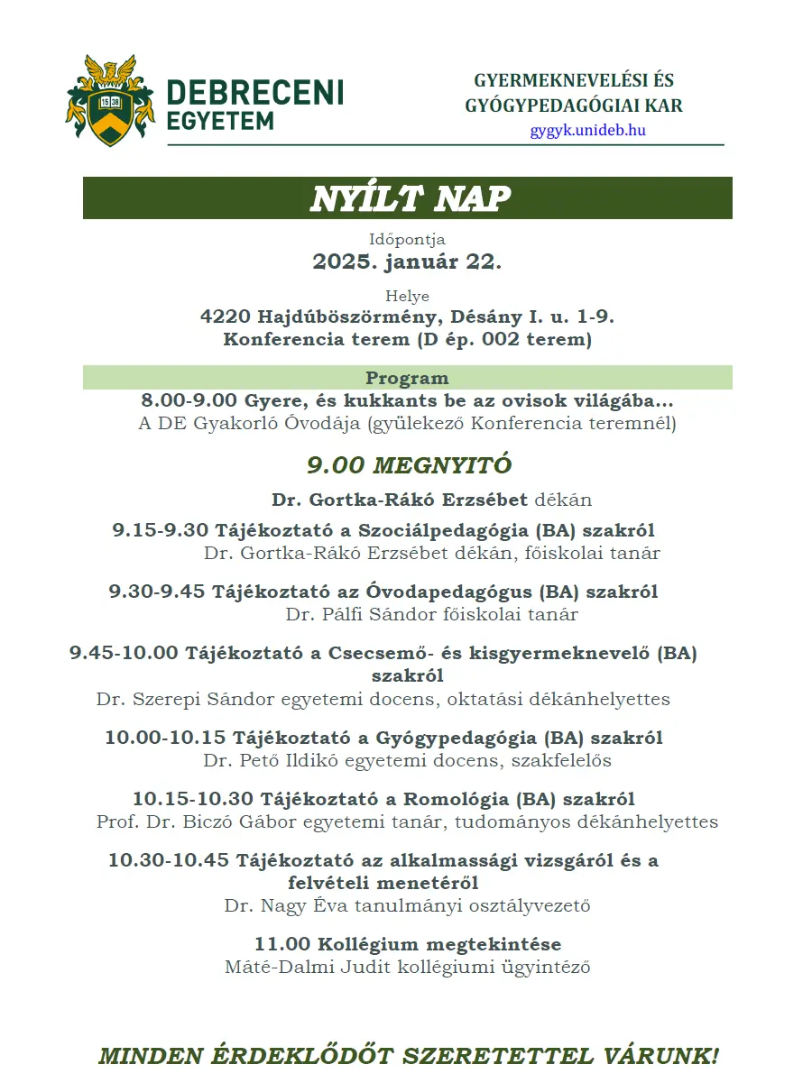 Nyílt nap a DE Gyermeknevelési és Gyógypedagógiai Karán | Gyermeknevelési és Gyógypedagógiai Kar
